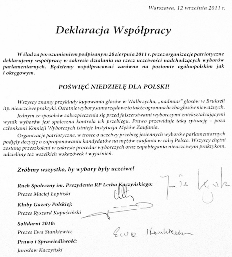 Porozumienie, poza prezesem PiS, podpisali: Ryszard Kapuściński, prezes Klubów "Gazety Polskiej", Ewa Stankiewicz ze stowarzyszenia "Solidarni 2010" i Maciej Łopiński z Ruchu Społecznego im. Lecha Kaczyńskiego.