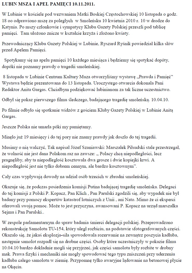 W Lubinie w kościele pod wezwaniem Matki Boskiej Częstochowskiej 10 listopada o godz. 18 oo odprawiono mszę za poległych w Smoleńsku 10 kwietnia 2010 r. 10 w drodze do Katynia. Po mszy członkowie i sympatycy Klubu Gazety Polskiej przeszli pod tablicę pamięci. Tam ułożono znicze w kształcie krzyża i złożono kwiaty.