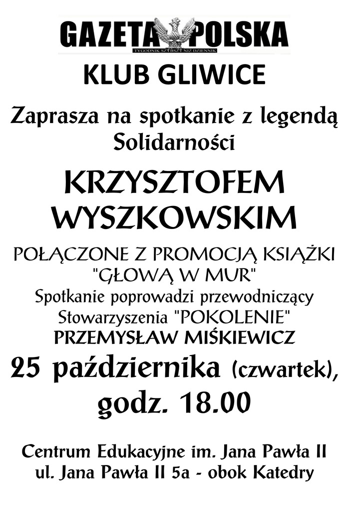 25.10.2012r. Gliwicki Klub "Gazety Polskiej" gościł znanego badacza najnowszej historii Polski Pana Pawła Zyzaka. Miało być spotkanie z Krzysztofem Wyszkowskim. Niestety zamiast w klubach śląskich, Pan Krzysztof zaniemógł i znalazł się w szpitalu. Wrażliwy i prawy człowiek nie mógł wytrzymać stałego ataku fałszywych oskarżeń i niecnych wyroków "niezależnego" postkomunistycznego wymiaru sprawiedliwości. Wymiaru przyzwyczajonego do ślepego przyznawania racji władzy, a teraz układowi okrągłostołowemu i przez ten układ ustalonym bohaterom.